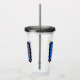Cette rondelle acrylique avec paille et couvercle a un hibou noir avec les yeux bleus assis dans un arbre noir contre un ciel bleu nuit foncé avec une pleine lune jaune et les étoiles dans une bordure noire incurvée sur le devant et le dos.