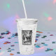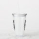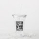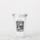 Cette rondelle acrylique avec paille et couvercle a une illustration en noir et blanc de Litle Red Riding Hood parlant aux bois sur son chemin à travers les bois sous les arbres portant une cape à capuchon dans un cadre noir orné sur le devant et le dos.