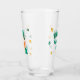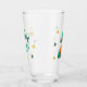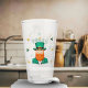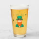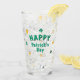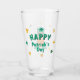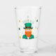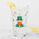 Leprechaun Clover Shamrock Patrick's Day Glass. Un verre festif sur le thème de la fête de la Saint-Patrick qui illustre un homme joyeux. L'homme porte un casquette vert avec une bande noire et une boucle d'or et a une barbe rouge vif. Son visage a une expression amicale avec un sourire. Le verre est entouré de shamrocks verts et oranges.