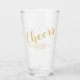 Script moderne Vitrage Mariage blanc et or avec titre "Cheers" en or police script moderne avec nom et date dans le style de police sans serif moderne.