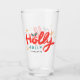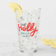 Christmas Holly Jolly Fun Winter Nom personnalisé Drinking Glass comprend le texte "Holly Jolly en rouge et bleu typographie de script de calligraphie moderne et personnalisée avec votre nom personnalisé. Accenté de saints et de flocons de neige. Cadeaux parfaits pour Noël et les fêtes de Noël ou pour les fêtes de Noël. Conçu par ©Evco Holidays www.zazzle.com/store/evcoholidays
