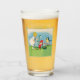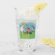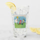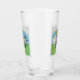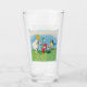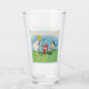 Ce caisson en verre pour boissons a une petite fille blonde en robe blanche avec de mignons petits elfes de Pâques en casquettes rouges debout à côté des fleurs de lys blancs, des oeufs de Pâques colorés et un oiseau chantant dans un cadre bleu clair chic sur le devant et le dos.