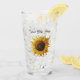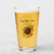 This glass tumbler for beverages has pretty fantasy big yellow and brown sunflowers with curled petals and tiny dots in multiple colours for accents in the center. Customise your text on the front and back with the templates.