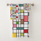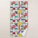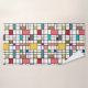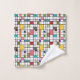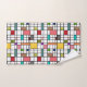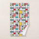 Ce set de serviettes a un design moderne du milieu du siècle d'une grille de lignes noires avec des carrés et des rectangles aux couleurs rétro sur un champ de blanc.