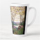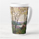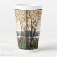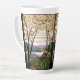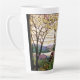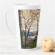 Magnifique Art Nouveau Tiffany Vitrine d'art raffiné Vitrail Reproduction des fleurs d'Iris à côté d'un lac, avec les Magnolia arbres fleuris ci-dessus, se trouve sur ce verre feuilleté Floral Latte Mug. Les images sont du domaine public en raison du copyright expiré.