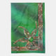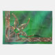 Une oeuvre abstraite en vert vif et en cuivre. Un bijou vert clair est entouré de lames d'herbe bordées de cuivre, agrémentées d'émeraudes étincelantes et d'étoiles oranges. Les fractales ondulantes et courbes de l'arrière - plan apparaissent en vert, marron et orange plus profond à l'intérieur du fil de cuivre du motif de la feuille.