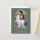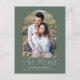 Annoncez la date de votre mariage avec style avec notre carte postale faire-part de mariage photo moderne. La simple carte faire-part de mariage présente votre photo de fiançailles à l'intérieur d'un cadre d'arche vert sauge foncé. "Sauver la date" est affiché en polices de caractères serif et script blanches modernes. Personnalisez le devant de la carte en ajoutant vos noms, date de mariage et lieu de mariage. La carte postale inverse pour afficher votre adresse de retour et les détails du mariage.