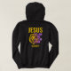 Christian JÉSUS LE LION DE LA TRIBU DE JUDAH sweat - shirt à capuche avec TEXTE PERSONNALISABLE. Poche avant et conception intégrale à l'arrière montre la silhouette de tête de lion déchiquetée en or avec typographie lilas/or audacieuse. Cela fait une déclaration audacieuse pour les croyants forts. Texte de poche avant : AU NOM DE JÉSUS, TOUS LES GENOUX SONT EN BAS, et texte arrière : JÉSUS A TRIOMPHÉ. Disponible dans d'autres styles et cadeaux correspondants. Idéal pour les déclarations de Noël et de Pâques.