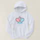 A bright, cheerful kawaii illustration of two stylized hearts about to kiss—one soft pink, one light blue—both with glossy highlights, rosy blush, and sweet closed eyes. The playful, affectionate mood is emphasized by three little hearts floating upward, creating a warm, romantic vibe that feels fun and innocent.