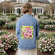 Cette veste de denim féminine présente des roses d'aquarelle luxuriante dans les tons rose, rouge, pêche et crème fleurissent sur un arrière - plan jaune citron.