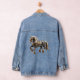 Fun Denim Jacket with image of a Steampunk style horse in gold and black. There are cogs, wheels, geers and gold decorations on shiny black.