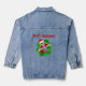 Cette veste en denim a un squelette cool avec des yeux ornementés portant un chapeau de Père Noël rouge à l'intérieur d'une forme dimensionnelle brillante rouge et vert éclatant. Joyeux texte de Noël en rouge.