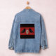 Cette superbe veste en denim est dotée d'une image graphique d'un crâne aux yeux rouges et aux dents jaunes recouvertes de fissures. Le crâne déplaisant a un grand corbeau debout de chaque côté comme un gardien. Les corbeaux sont noirs avec des pattes grises et des griffes. Ils ont aussi des yeux noirs beady.