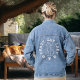 CRAZY CHAT DAME jolie veste en denim. Une silhouette de chat simple centrée dans un cercle de la formulation CRAZY CAT LADY avec trois pattes de chat placées pour fermer le cercle. Le design est en blanc.