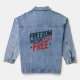 "Freedom isn't free." Patriotic denim jacket design with bold red and blue stripes and stars, honoring those who sacrifice for our liberty.