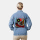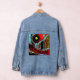 Step out in bold style with this Denim Jacket featuring Frequency Serpent. A serpentine red structure curves vertically across the fabric, marked by circular elements resembling vibrational cores, while horizontal bands of blue, green, and white flow in the background like waves of data. The interplay of intense colors and curved forms creates dynamic tension, transforming this classic denim piece into a wearable canvas of digital abstract art. Perfect for casual looks, artistic expression, or gifting to those who love fashion with energy.