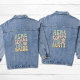 Jolie blouson en denim de la fête de la bachelorette pour les demoiselles d'honneur de la mariée et les besties avec "Here Comes The Party" dans une large police ondulée rétro dans les tons vert sauge poussiéreux, rose, bleu et jaune et une illustration style années 70 d'une fleur. Une veste "Here Comes The Bride" est disponible pour la mariée.