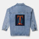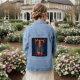 This is a festive, spooky illustration featuring an ornate, glowing orange letter 'T' that looks like an ancient, horned pillar, decorated with autumn leaves and vines. It is centered above two glowing, grinning jack-o'-lanterns nestled in a pile of fallen leaves against a dark, hazy teal background.