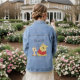 This women’s denim jacket features a soft minimalist illustration of a yellow bear and a giraffe, designed to express warmth, connection, and gentle emotion.