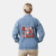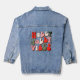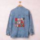 Retro Christmas Holly Jolly Vibes Vacances tendance Girly Denim Jackets présente le texte "Holly Jolly Vibes" dans un script rétro en rouge, vert et rose accentué d'étoiles et de mignons visages heureux. Conçu par ©Evco Holidays www.zazzle.com/store/evcoholidays