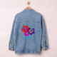 Réunion de famille, veste en denim personnalisée. Dessin de fleurs d'hibiscus au dos avec deux emplacements pour le texte bleu aqua. Un grand design floral audacieux, en rouge, rose foncé et violet, avec du texte en haut et en bas, est parfait pour créer un souvenir pour les membres de la famille. Incluez le nom de famille avec l'année de la réunion, ou tout texte qui convient à l'espace.