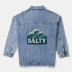Giant whitecap waves roll toward the beach in this retro style coastal graphic. Cream vintage SALTY text makes a bold contrast against the teal blue ocean. The graphic is printed on the back for an eye catching look. Made for beach bums, surfers, sun seekers and anyone living on island time. This unique denim jacket is a great way to add seaside vibes to any outfit.
