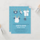 Un petit salaud est en route ! Célébrez avec maman d'être avec un baby shower de baseball à thème! Idéal si les parents sont fans de baseball ! Cette invitation au baby shower de baseball a de mignons articles bébé accrochés à la ligne de vêtements pour le petit. D'une couche de baseball, d'un casquette avec une icône étoile, de tee - shirts de baseball et d'un mitten. Personnalisez facilement avec les détails de la fête. La palette de couleurs bleu et blanc est la plus appropriée pour bébé garçon.