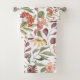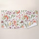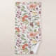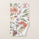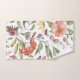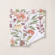Floral-patterned towel set on a wall, featuring vibrant pink, orange, and yellow flowers and green leaves. Below, a matching washcloth is displayed.
