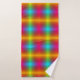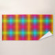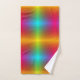 Vibrant rainbow gradient towel set and washcloth on display. Towels feature a smooth color transition from orange to blue, creating a lively, cheerful vibe.