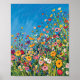 This vibrant painting depicts a field of wildflowers under a bright blue sky. Featuring daisies, poppies, and other blooms in shades of orange, pink, red, blue, and white, the artwork captures a lush, lively scene. The clear sky with fluffy white clouds adds depth, while the impressionistic style with bold brushstrokes and vivid colors evokes a cheerful, sunny day. Perfect for brightening up any room with a touch of nature.