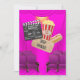 Illustration ludique et tendance d'un cinéma avec des sièges, des rideaux roses vifs, une moquette rayée menant au passage entre les sièges, des lumières vives, du pop-corn, un hot-dog, un ticket d'accès et un plateau de papier, le tout pouvant être customisé pour votre célébration spéciale.