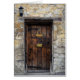 Carte de voeux avec une vieille entrée principale en bois dans une façade en pierre d'une maison avec une lumière au-dessus de l'entrée.