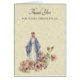 Ceci est une belle image traditionnelle de la Vierge Marie, Notre-Dame de Grâce avec des fleurs à ses pieds et un fond de dentelle beige. Le texte à l'intérieur peut être personnalisé ou supprimé pour être laissé vide.