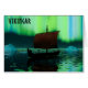 Une image légèrement stylisée d'un longship viking naviguant la nuit sous les aurores boréales là-bas quelques icebergs ; la plupart de l'équipage est endormi. Le texte "VIKINGAR" (Vikings) apparaît également.