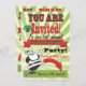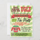 Soirée de Noël super amusante et moche avec une sensation rétro. Lettres modernes, bannières et un pull moche contre un arrière - plan qui éclate de soleil. Le dos est un grand comme le devant avec l'ancienne image clipart du Père Noël rétro et des informations de fête. Illustration tirée à la main par McBooboo. com