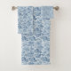 Une scène de village d'une époque révolue de bétail, de gens, de maisons en pierre et de ponts dans un motif de toile de jouy magnifique et élégant. Belle couleur bleue traditionnelle.