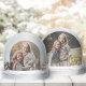 Illustration de vacances pittoresque avec une rangée de maisons aux toits enneigés et au ciel enneigé avec modèle photo en arc à l'avant et modèle photo unique à l'arrière.