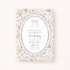 Elegant vintage floral first birthday invitation featuring a delicate pink bow and a scalloped oval frame surrounded by soft romantic flowers. This classic baby girl first birthday invitation is perfect for a sweet, timeless celebration with a gentle heirloom feel.