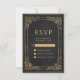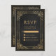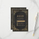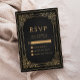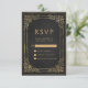 Cette élégante carte RSVP de mariage présente un cadre doré vintage orné sur un arrière - plan hors du noir en détresse, imitant une couverture de livre antique. La conception du cadre est répétée à l'arrière de la carte.