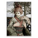 rendu numérique 3D d'une belle geisha vintage portant des vêtements traditionnels assis dans un pavillon, ciel bleu et arrière - plan de fleurs de cerisiers, effet de dessin
