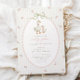 This baby shower invitation design features a cute goose and her mama, and a whimsical vintage frame design with stripes and garden flowers. Perfect for the trendy goose/duck theme, or backyard garden baby showers.