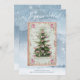 Un arbre de Noël vintage illustration d'art étiquette superposé sur une aquarelle hiver neige scène arrière - plan en bleu et blanc profond. Scène de neige sur le dos aussi. Une carte saisonnière avec une douce scène de nature sereine pour une ambiance chaleureuse.