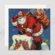 Illustration vintage Joyeux Noël design avec un joyeux Père Noël sur une escalade de toit enneigée sur la cheminée avec un sac plein de jouets, cadeaux emballés, nounours et tambours le soir de Noël. Joyeuses fêtes et Bonnes Fêtes !