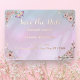 Annoncez votre journée spéciale avec la Vintage Peony rose Peony Real Foil Save the Date, avec roses d'aquarelle et pivoines sur un arrière - plan rose et bleu onirique. Le choix de l'or rose, de l'or ou de l'argent luxueux ajoute une touche de charme vintage. Cette carte de date est parfaite pour un mariage de jardin de printemps ou d'été et fait partie d'une collection de mariages de feuille réelle complète, y compris des invitations, menus, programmes, et plus, pour s'assurer que votre papeterie mariage est magnifiquement coordonnée.