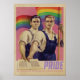 Affiche de style propagande soviétique vintage, avec un Russe asiatique et une blonde agitant un drapeau de la fierté arc-en-ciel avec les mains en contact. Les hommes portent des salopettes debout contre un arrière - plan rose. Le slogan en bas dit : "Criez-le depuis les toits, criez-le haut, criez-le au monde, soyez GAY et FIER".