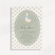 Sweet and timeless baby shower invitation featuring a charming storybook-style goose illustration with a soft blue bow, set inside a delicate scalloped frame. The gentle sage green center and tiny floral background create a romantic cottage-inspired look that feels warm, nostalgic, and beautifully refined. Classic typography and a balanced layout give this design an elegant, heirloom-quality feel perfect for a special celebration.