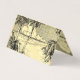 Des cartes de visite pliés sur mesure avec des scripts rétro et des lettres de blocs sur une gravure vintage tropicale de palmiers sur une plage de sable et de beaux nuages sur des vagues océaniques calmes sur un arrière - plan faux parchemin.