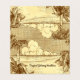 Des cartes de visite pliés avec un script rétro modifiable et des lettres de blocs sur une gravure vintage tropicale de palmiers sur une plage de sable et de beaux nuages sur des vagues océaniques calmes en marron, sur un arrière - plan faux parchemin.