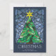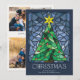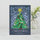 Ces cartes de voeux de Noël à plat de 5" x 7", lumineuses et colorées, sont dotées d'une vitrine en verre aquarelle faite à la main d'un arbre de Noël vert avec une étoile d'or et des ornements rouges encadrés dans les tons bleus sur un arrière - plan bleu marine. L'accueil est "Noël", en grandes lettres décoratives avec un message d'accueil modifiable, "Je vous souhaite la paix, l'amour et la joie cette saison des fêtes."