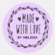 Un autocollant personnalisé "fait avec amour" sur un arrière - plan violet lavande entouré d'une couronne de laurier. Faites-le le vôtre en ajoutant votre propre nom. Une jolie touche de finition pour tous vos cadeaux faits main. Conçu pour vous par Blackberry Boulevard.
